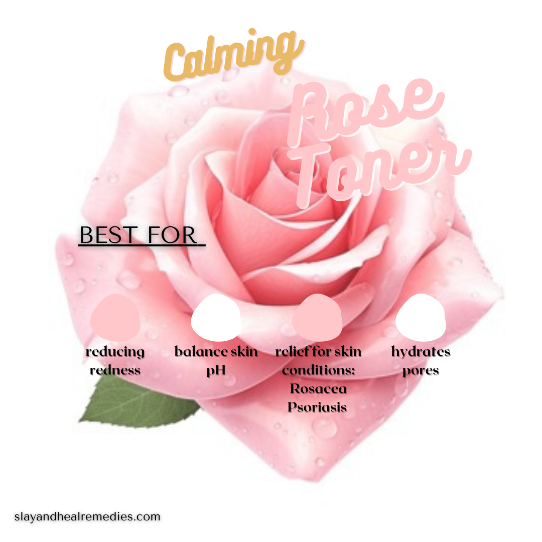 Hydration will always be key! The Calming Rose Toner allows your pores to take a deep breath! The organic rose petals infused in our toner allows your skin to thrive comfortably and assist in balancing your skins natural pH! This toner is perfect for dry or sensitive skin & also some skin conditions listed below. Botanical toners provides a calm sensation to your pores & soothing hydration all day! Comes in a 60ml white spray bottle.